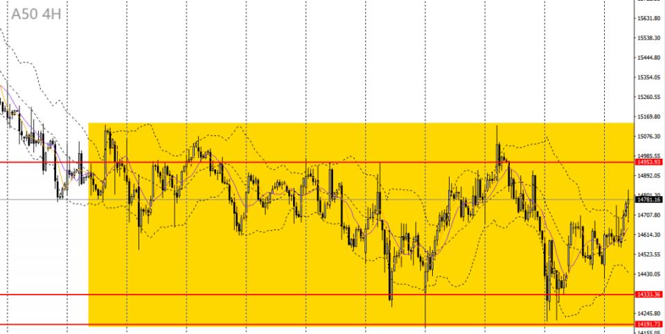 A50昨日继续拉升,站上日线布林中轨,日线RSI位于50左右,4小时仍处于此前震荡区间,大概率将再度上探14800-15000一带,多单仍可持有。
