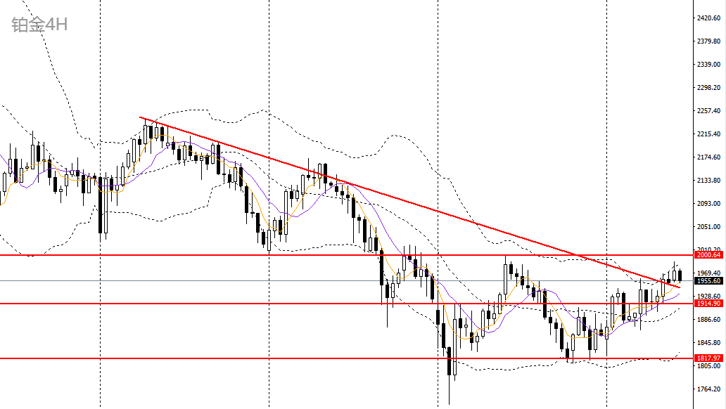 铂金延续反弹,日线RSI回升,4小时升破下行趋势线,短线走势偏强,上方继续关注2000附近阻力,如承压于下方,多单建议离场。