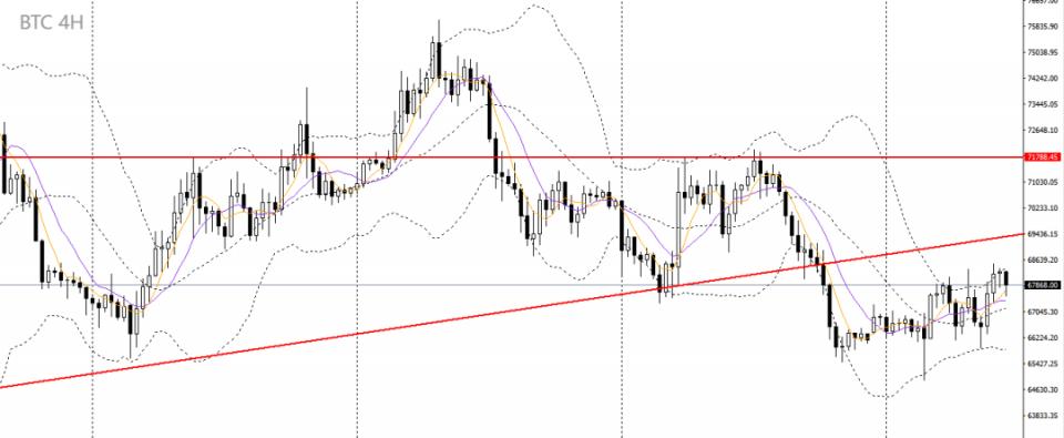 比特币昨日小幅回升,日线RSI仍位于50附近,4小时延续震荡上行,多单力量有限,预计仍将徘徊于68000-70000一带,可保持观望。