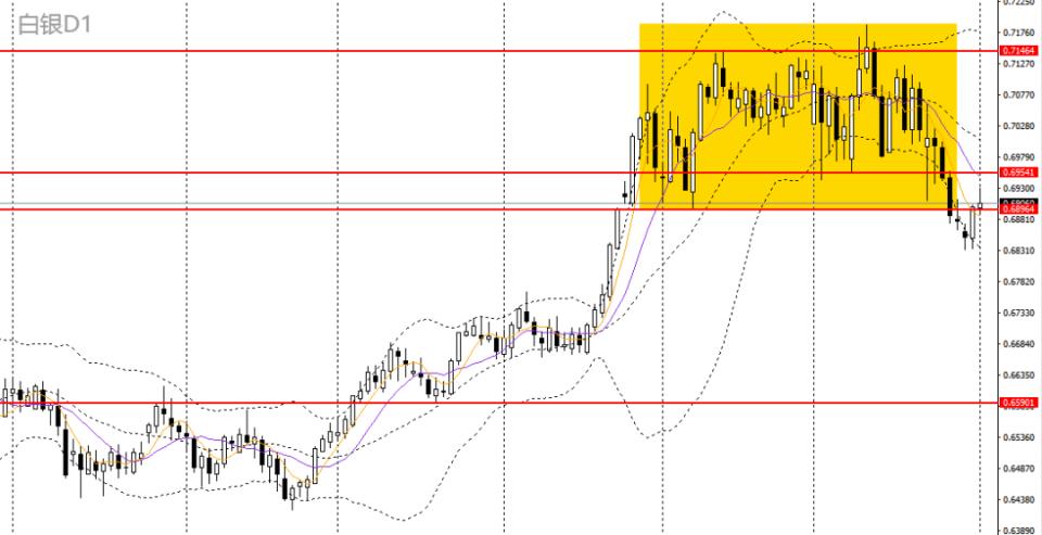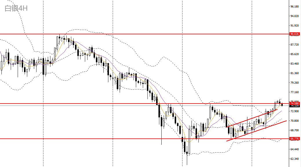 白银昨日收长阳柱,4小时刺破74-75压力带,上破上行通道上沿,如无法有效站上75,多单可暂时离场。