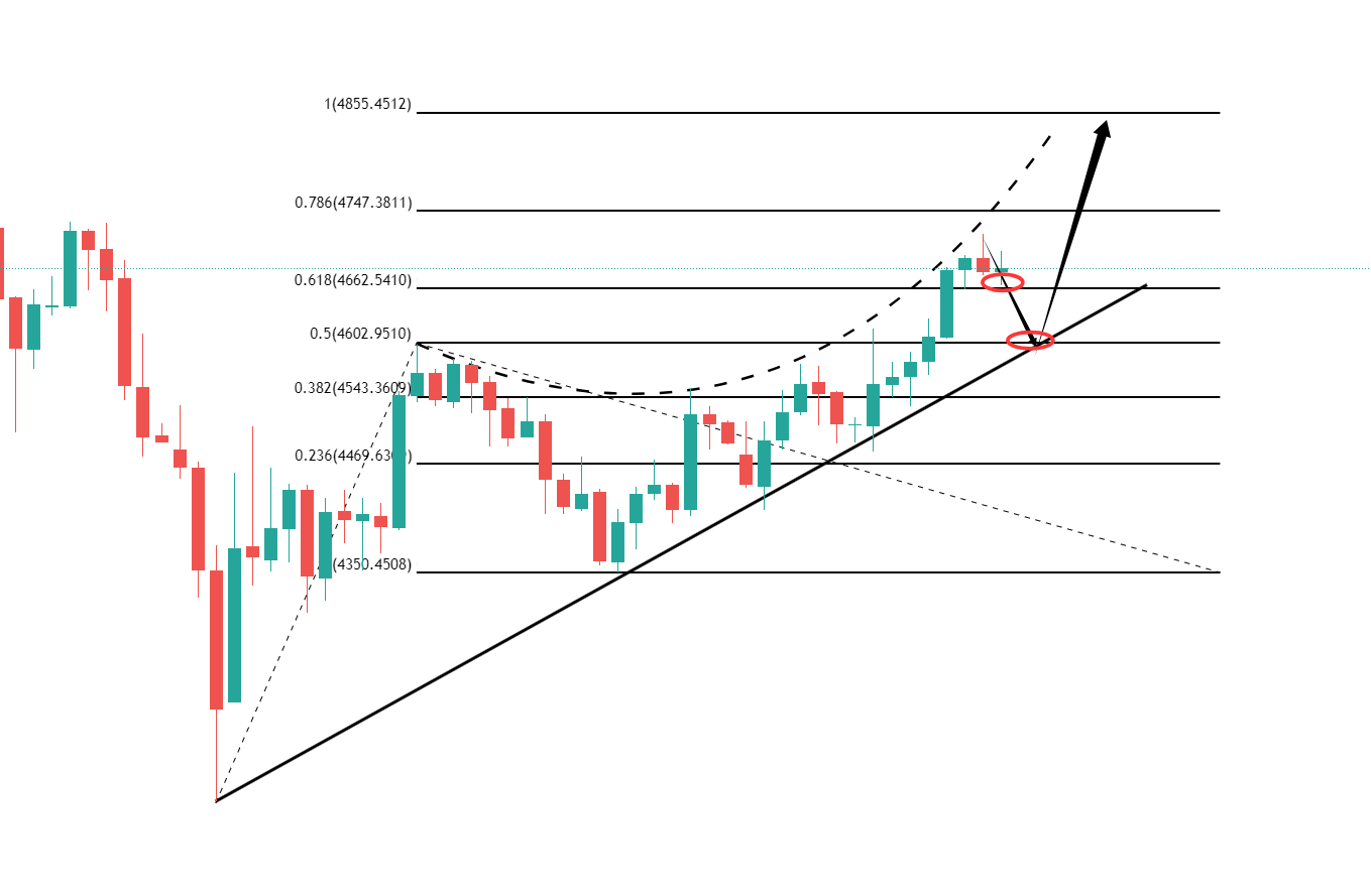 上方目前没有固定的趋势压力线,因为它是一个弧形顶部,当然别误会,常规弧形顶确实是需要在末端看跌,那是建立在拱形的弧形,而现在是什么情况?顶部无限向上扩张好吗?在这种情况下当然是看上涨拓展,哪怕4730,你看到这个顶部遇到回落,那也不是一个所谓的看跌信号,你可以说在这里看个回调,那也仅限于国际黄金,前提是你要跑的快,因为现在的交易环境,可以说下跌是不确定的,而上涨才是确定性行情,稍有不慎可能就会陷入泥潭。