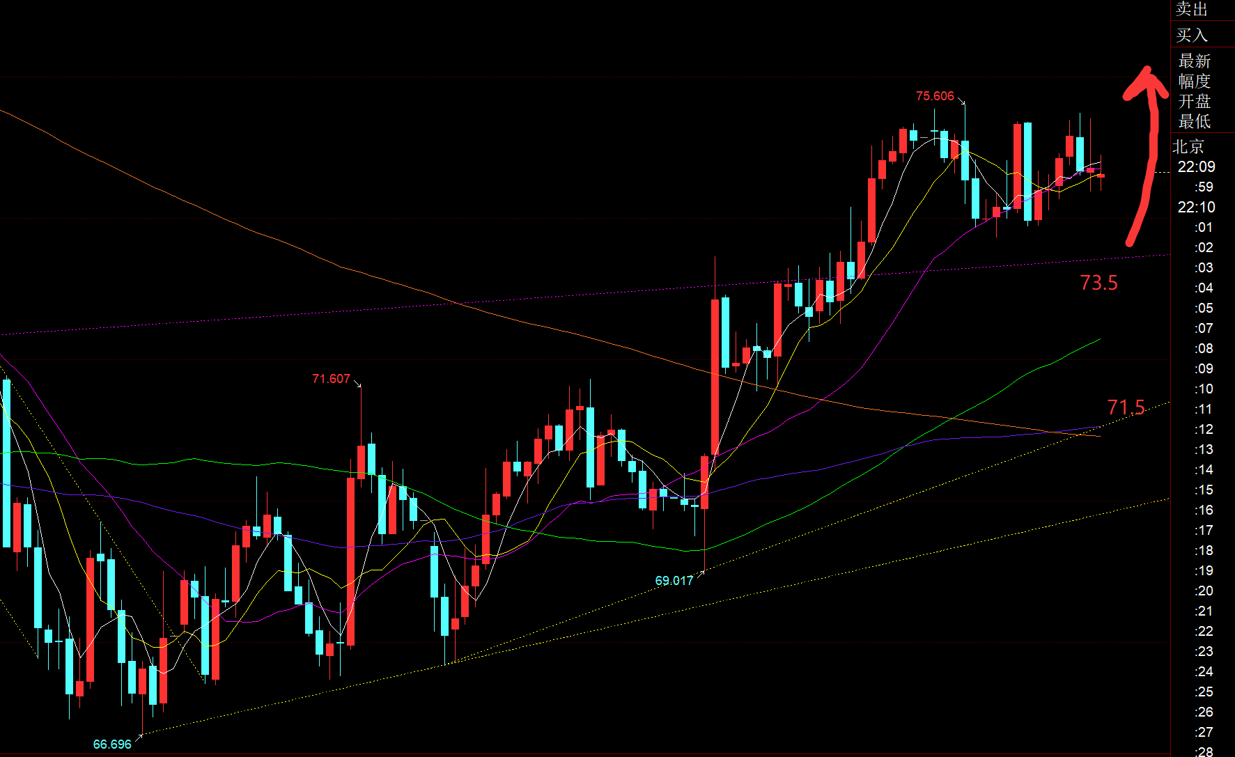 第二,白银方面:昨日依托顶底71.7上继续看北,最终抵达75目标;