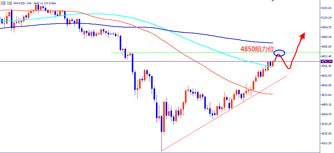 黄金连续四日收阳,强势突破 4750 美元关口,多头动能集中释放,但临近 4850 美元强阻力区域,短期冲高动能减弱,4800 上方回调风险剧增。今日行情以 “冲高遇阻、震荡回落” 为主,操作上 4850 附近高空为主,低多为辅。回调下来的机会请珍惜,不在讲第二遍!