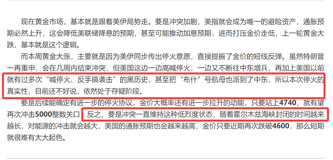 这个消息一出,市场瞬间一片哗然,反应特别剧烈。前一天还喜气洋洋、全线走高的资本市场,直接被这条消息吓懵,一路一泻千里。关于美伊冲突对黄金的影响逻辑,弈善昨天的金评里已经给大家重点解析过了,今天再跟大家强调一遍——现在的核心逻辑是,美伊冲突持续时间越长、冲突越剧烈,对全球能源的冲击就越大,各类工商业材料都会涨价,通胀必然会上涨,美联储甚至可能从降息周期,直接转向“加息”周期。这就是为什么,只要市场有一点冲突加剧的消息,油价就直接暴涨,风险资产就全线下跌的原因。