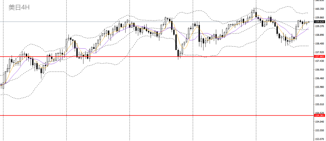 美日周四强势反弹,升破5日均线,日线RSI位于50之上,4小时多头力量占优,159附近企稳可进多,短线仍有望挑战160.40一线压力。