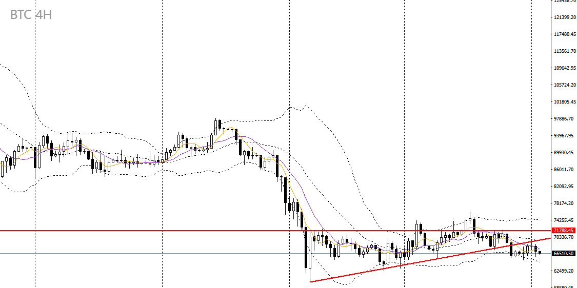 比特币昨日小幅回落,日线RSI位于50之下,如继续承压于68000-70000压力带下方,短线大概率将延续震荡下行。