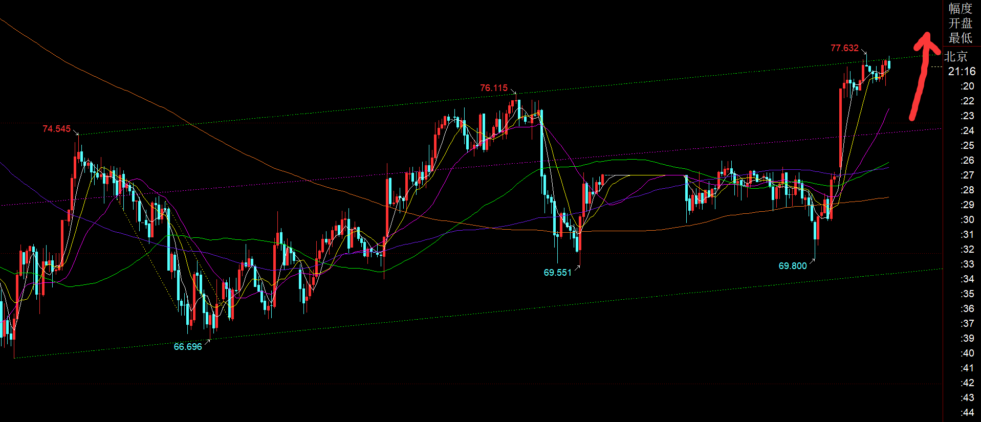 白银方面:从图中看,今日早间一波拉升,也直接测试到了绿色通道上轨,昨晚69.8打出的低点,算是最后的洗盘,等同于黄金4600都形成了双底;因此69.8之下的北上底仓,就基本可以安稳拿住看; 今日关注74.5之上企稳继续北上,不断测试绿色通道上轨,或进行高位的持续横盘,来消化macd下行动能,这也是一种不错的常见走法;