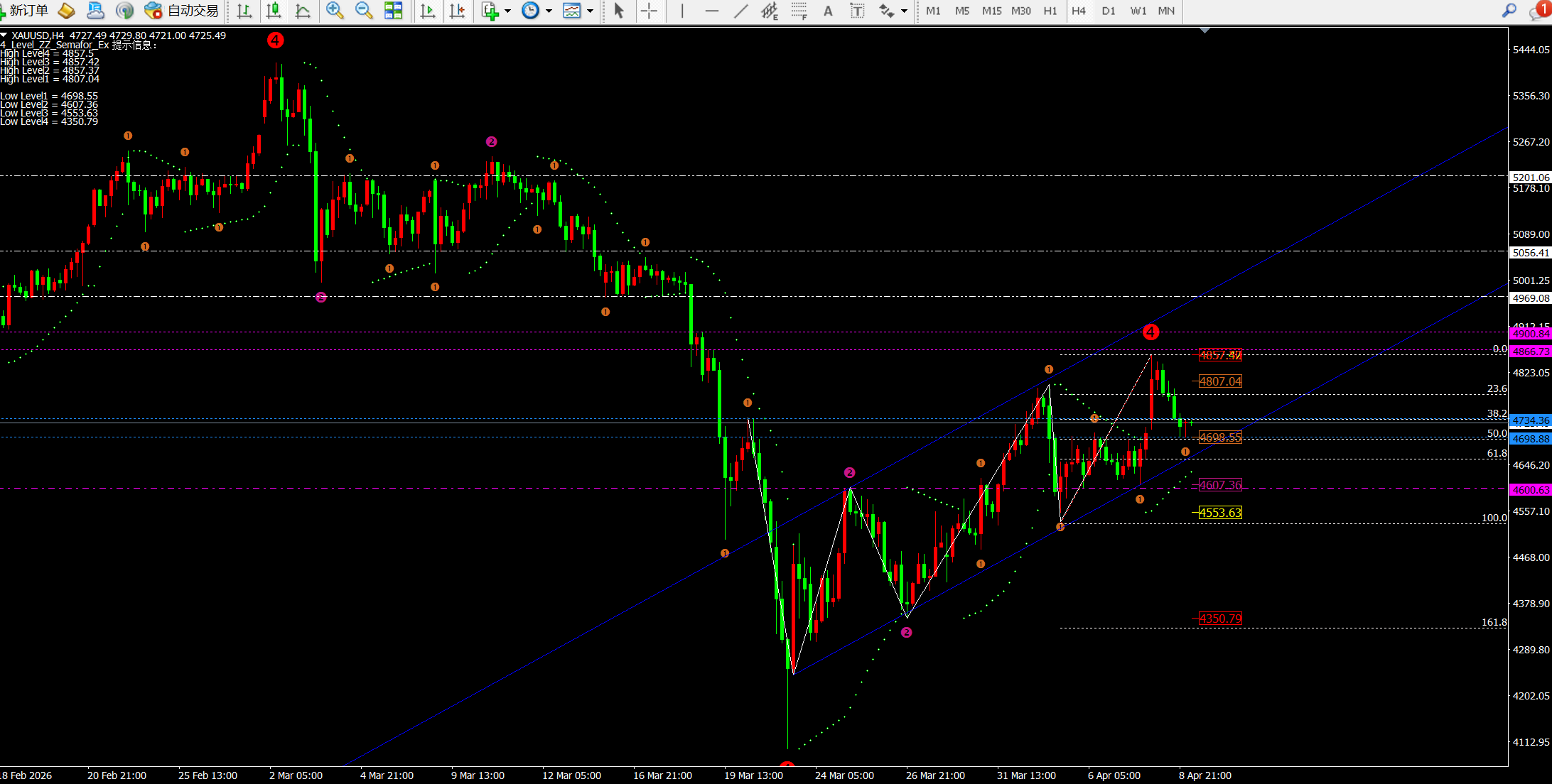 ② 4小时昨日下跌后早间4小时收线十字星,代表价格的震荡。目前我们主要关注中轨的支撑即可对应4701-4696一线,其次是下方的抛物转向点和均线MA60支撑对应4631-4608一线。不过随着时间推移都会相应抬高。而4小时的斐波拉契回调线目前支撑在0.50位置4694一线,而0.618位置位于4655一线。