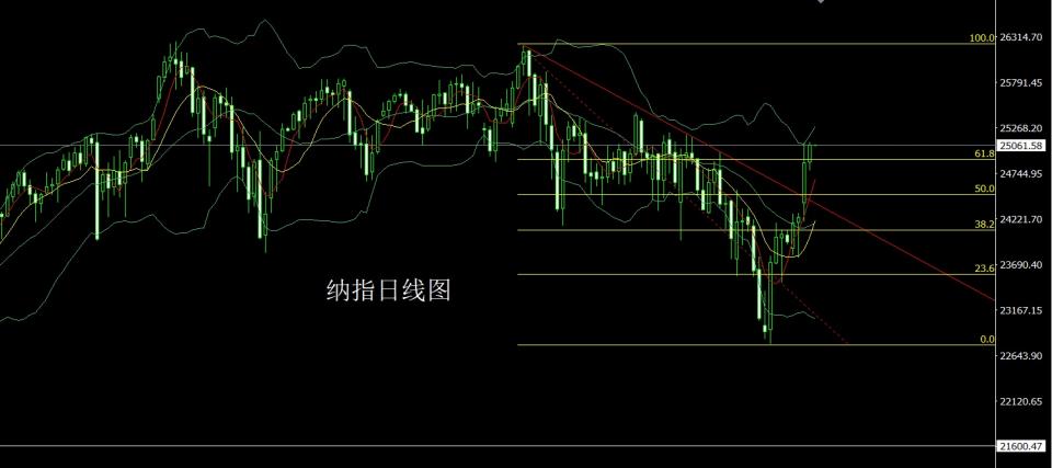 纳指市场昨日开盘在24869.56的位置后行情先回落,日线最低给到了24777.5的位置后行情强势拉升,日线最高触及到了25100.65的位置后整理,日线最终收线在了25061.2的位置后,日线以一根下影线很长的中阳线收线,而这样的形态收尾后,今日的行情回踩多,点位上,今日24850多止损24790,目标看25000和25100和25150-25200.