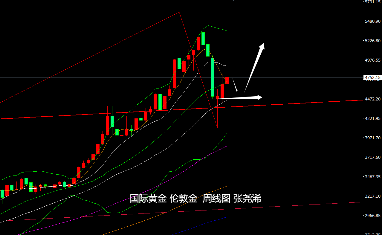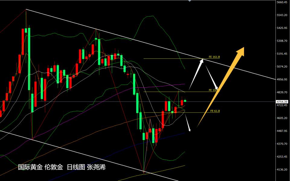周图级别,金价本周目前延续前周的触底回升看涨形态再度走强,目前运行在中轨之上,但未能突破10周均线阻力4900美元上方,如本周收取倒垂或十字形态,则下周偏向回踩4500美元关口或其下方后再度反弹。反之则将继续走强上行。