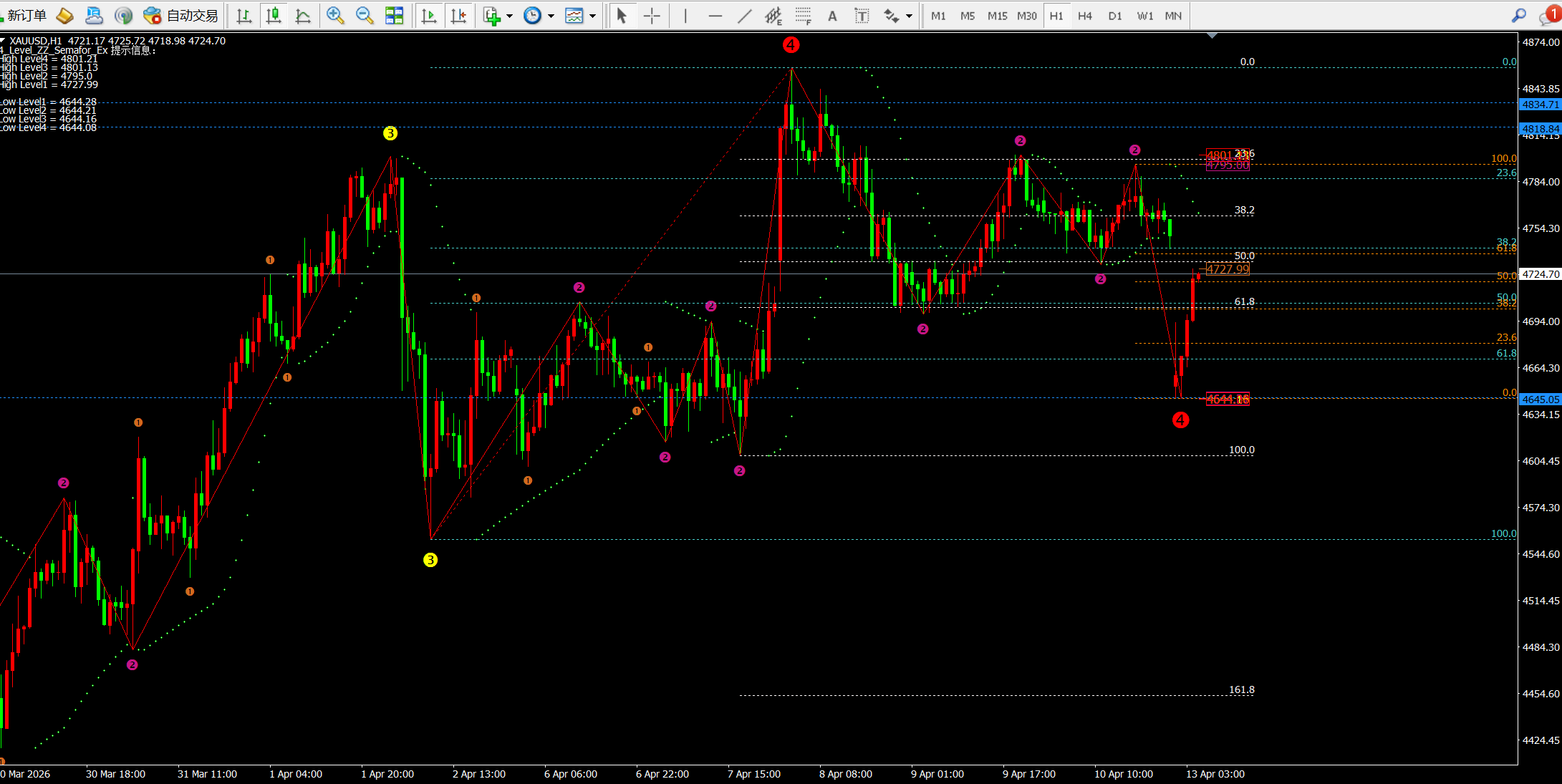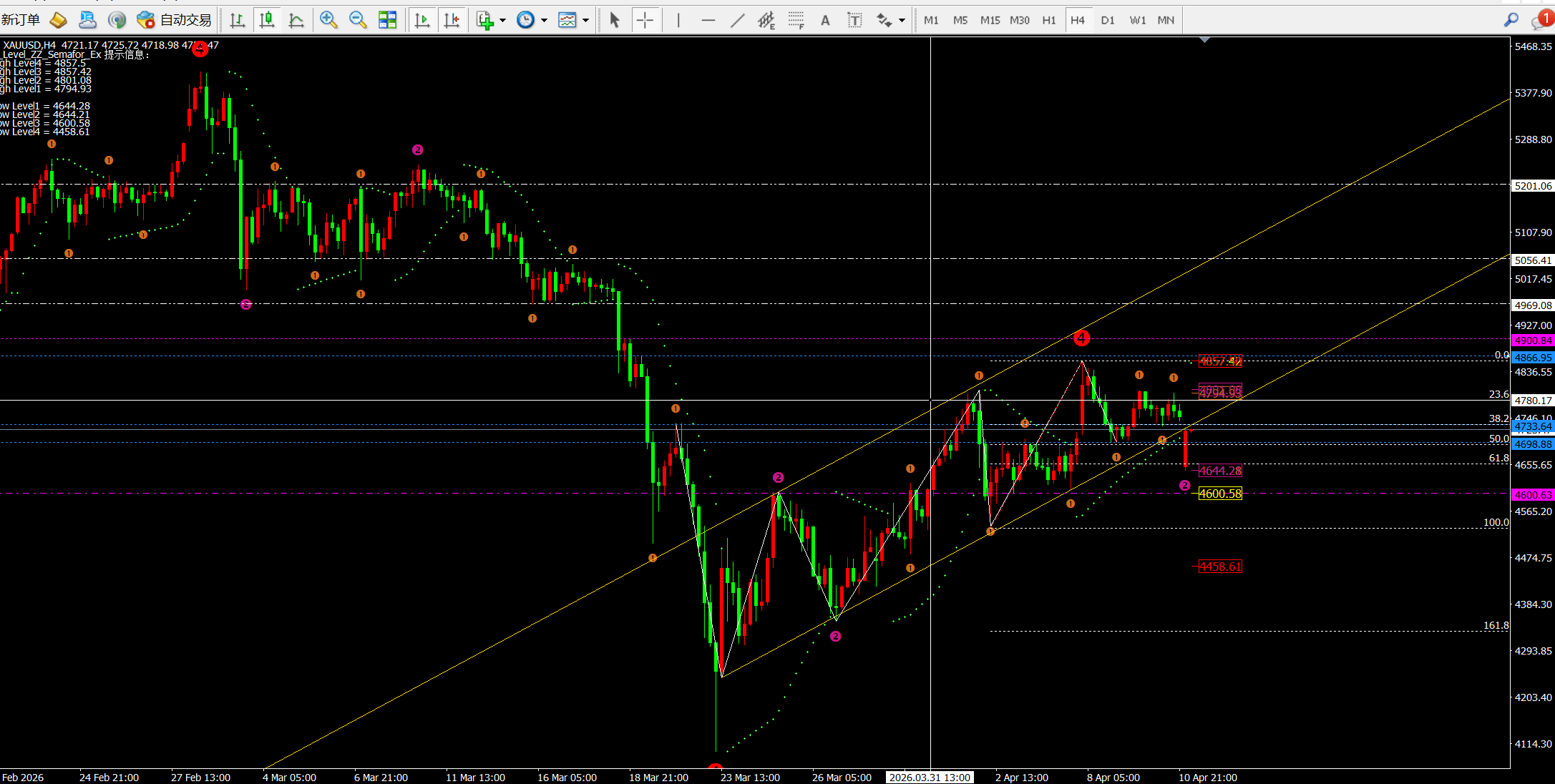 根据日线的斐波拉契回调线看:目前价格试探4742-4758一线,短期支撑4610附近强支撑4550一线。
