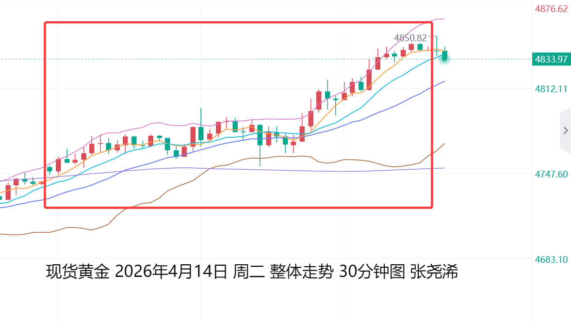 上交易周二(4月14日):国际黄金/伦敦金延续周一触底回升之力,以及美元指数跌至六周低点,同时市场对美伊谈判重启的乐观预期显著升温,原油价格也继续回落,共同缓解了因中东冲突引发的避险与通胀双重压力的利好提振,而反弹走强收涨,并突破30日均线阻力,短期多头动力偏强,但目前临近30周及60日均线压力位置,短期留意遇阻回调风险,如突破60日均线阻力,则有望进一步看涨至5100关口附近。