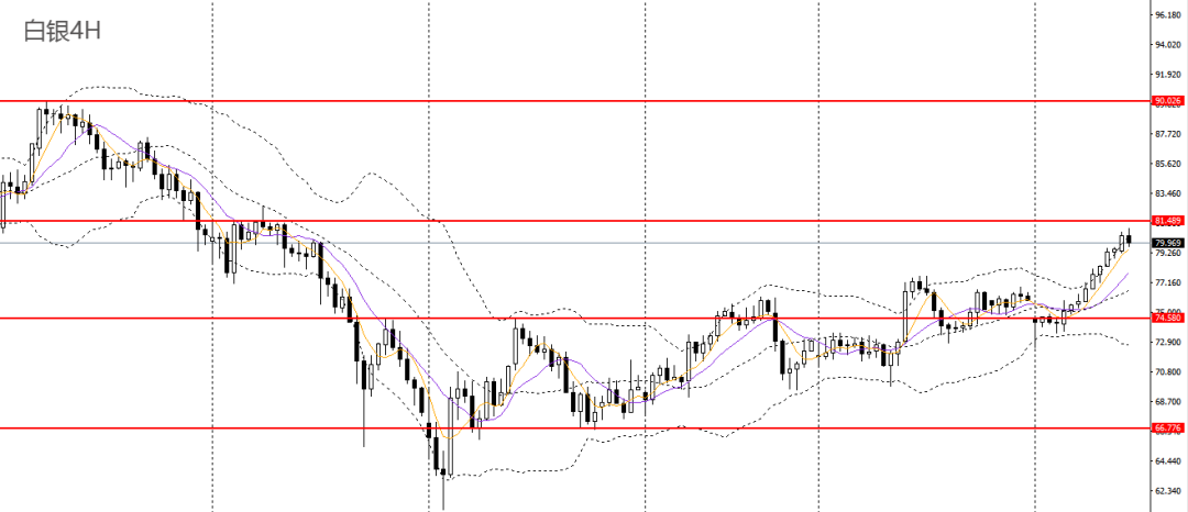 白银延续上行,刺破日线布林上轨,4小时逼近81关口压力,78上方可维持多头思路,短线预计将继续挑战81.50一线。