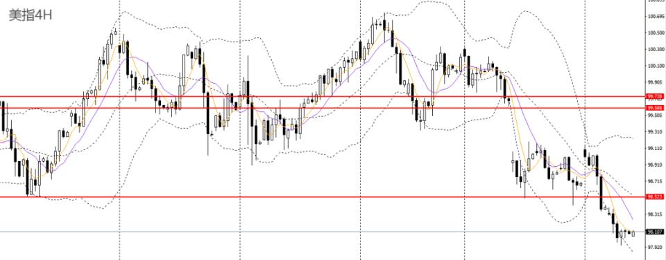 美元指数昨日收长阴柱,仍徘徊于日线布林下轨附近,如站稳98关口,短线预计将延续反弹,上方首先关注98.40-98.50一带压力。