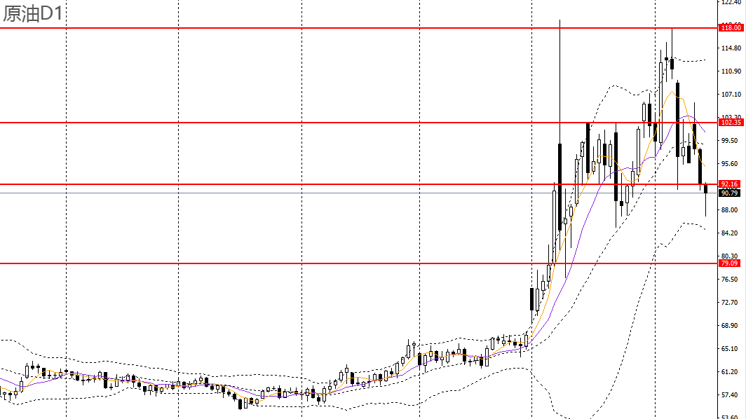 美原油周二大幅走低,承压于5日均线,4小时失守92附近支撑,短线趋势转弱,空单仍可持有,后市有望继续回踩85一线。
