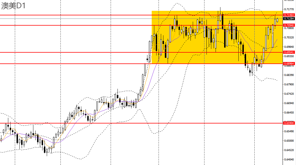 澳美周二继续走高,触及0.7140附近阻力,4小时有望打破当前区间震荡格局,如于0.71附近企稳可进多。