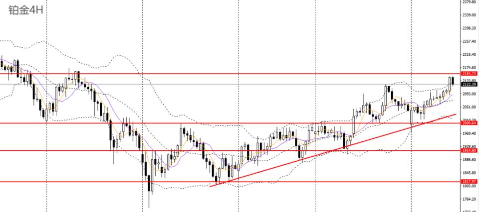 铂金周二再收涨,站上5日均线,4小时立于上行趋势线之上,2090-2100一带企稳可进多,后市可继续上看至2150。