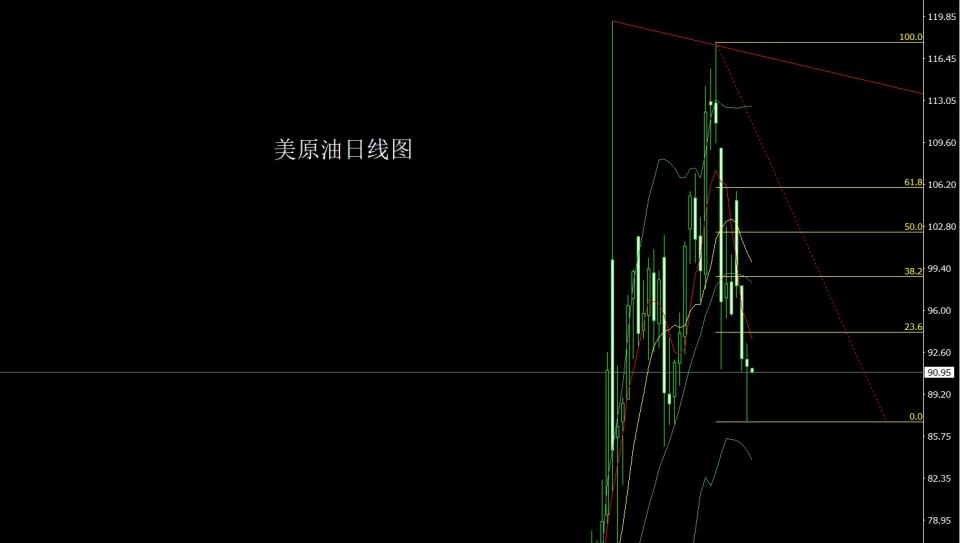 美原油市场昨日早盘开盘在92.05的位置后行情先快速回落,日线最低给到了86.92的位置后,行情强势拉升,日线最高触及到了93.35的位置后整理,日线最终收线在了91.42的位置后,日线以一根下影线极长的锤头形态收线,而这样的形态收尾后,今日早盘先回落87.5多止损87,目标看89和90和92.