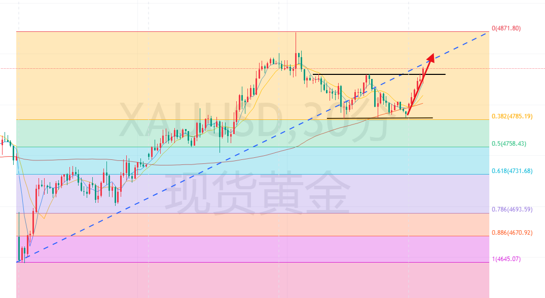 当前,黄金在4786受到支撑走反弹,这个位置,昨晚三次测试都没有下破,彰显出此支撑的有效性,而这个位置,也是今天日线5日均线的支撑位,金价早间依托日线5日均线走反弹,短期应该还会延续走高,短期阻力关注4831,这个昨天午后反弹的高点,也是昨晚美盘反弹的高点,若有效突破此位,多头将继续走上升,进一步压力关注4839和4871,强阻力关注4915-30,日内若继续冲高4915附近,可以去尝试布局空单。