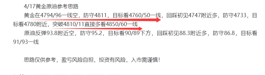 近期市场围绕中东局势持续发酵,日内随着以色列跟黎巴嫩达成为期10天的停火协议,伊朗目前正式宣布开放霍尔木兹海峡,供所有商船通行,消息一出,黄金直线拉伸,原油破位下行,我们日内跟大家分享的黄金思路先空然后在4810/11附近破位看涨,空单回踩最低4780附近有15个点左右空间,没有及时离场的会被洗掉,然后4810/11破位多的话目前兑现到了4840上方目标位,超过30美金空间,晚间的话关注回踩延续的机会,但是周五晚间谨防周末有一些幺蛾子,大家尽量不要持仓过周末!更多实时策略以笔者盘中实时指导为准!
