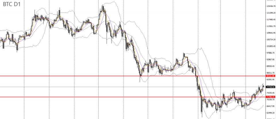 比特币昨日延续上行,升破前高,日线RSI位于50上方,4小时立于上行趋势线之上,短线趋势再度转强,如站上80000大关,后市有望挑战84000附近。