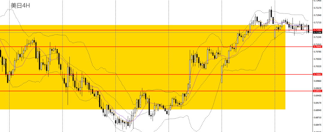 澳美昨日收小阳线,今日亚盘拐头下行,4小时刺破0.7140一线关键支撑,多头力量减弱,0.7160一线如再度承压可进空,后市大概率将继续下探0.71-0.7120。