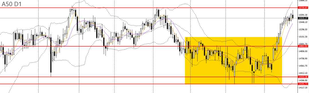 A50周三强势走高,创3个月来新高,4小时逼近关键压力15700,如无法有效升破,多单可暂时离场。