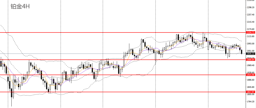 铂金昨日小幅反弹,4小时触及2100关口附近遇阻,呈复杂双顶,2100下方可维持高空思路,下方首先关注1980-2000支撑带。