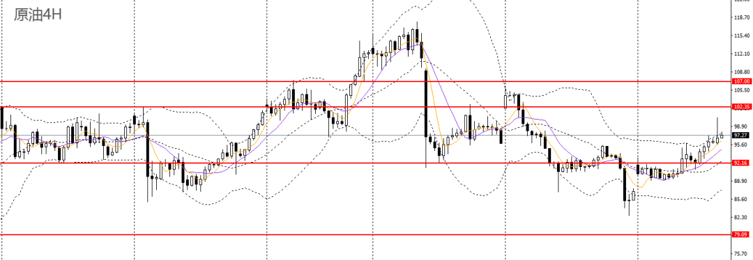 美原油昨日再收长阳柱,刺破日线布林中轨,4小时上破95一线压力,多单可继续持有,后市预计将再度挑战100关口,如彻底站上,可看多至102。