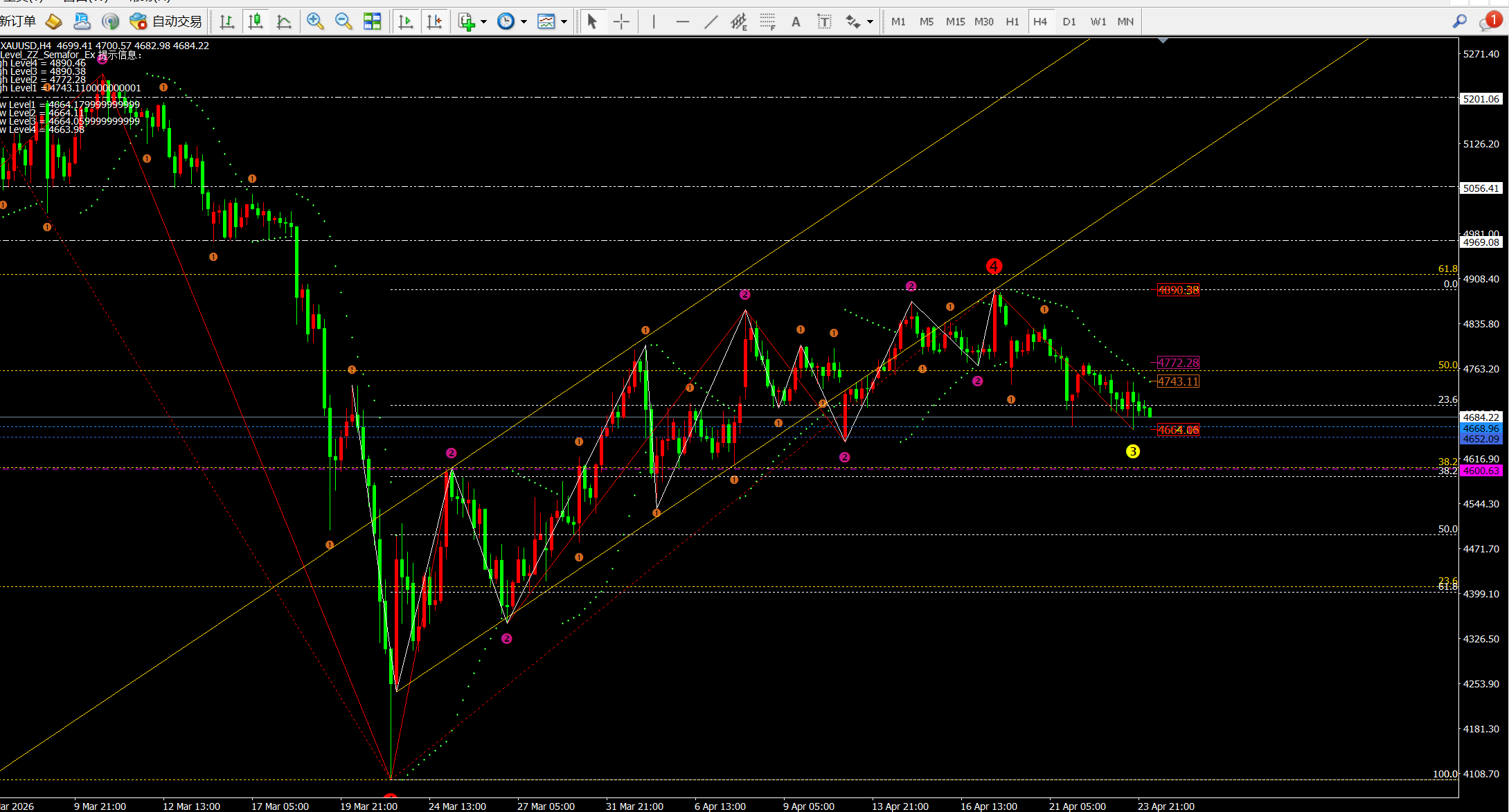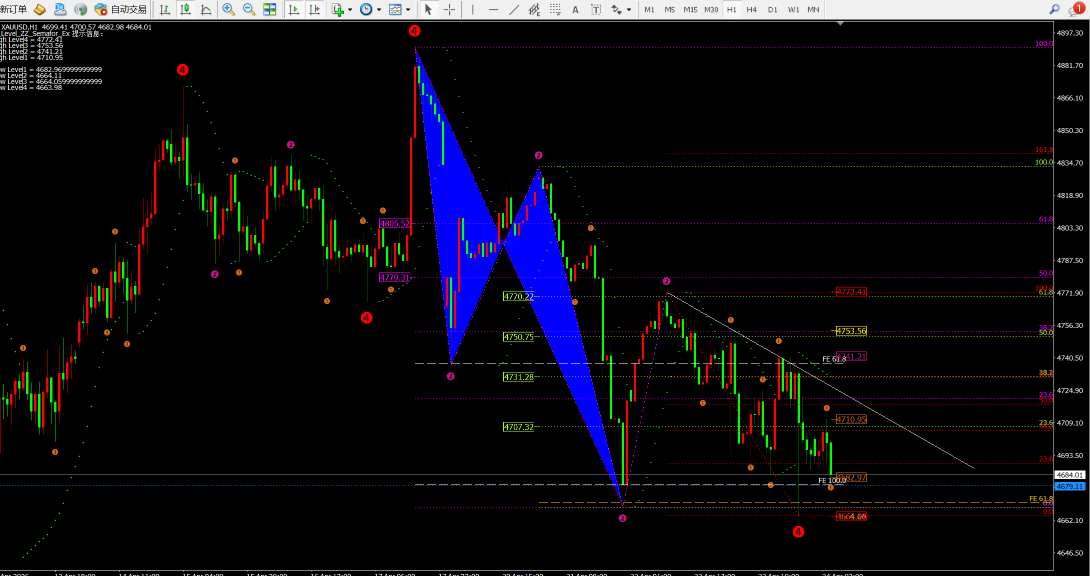 综合而言:目前价格属于震荡下跌,但是下跌的动能在放缓;因此低点4664和4644可能面临反弹。