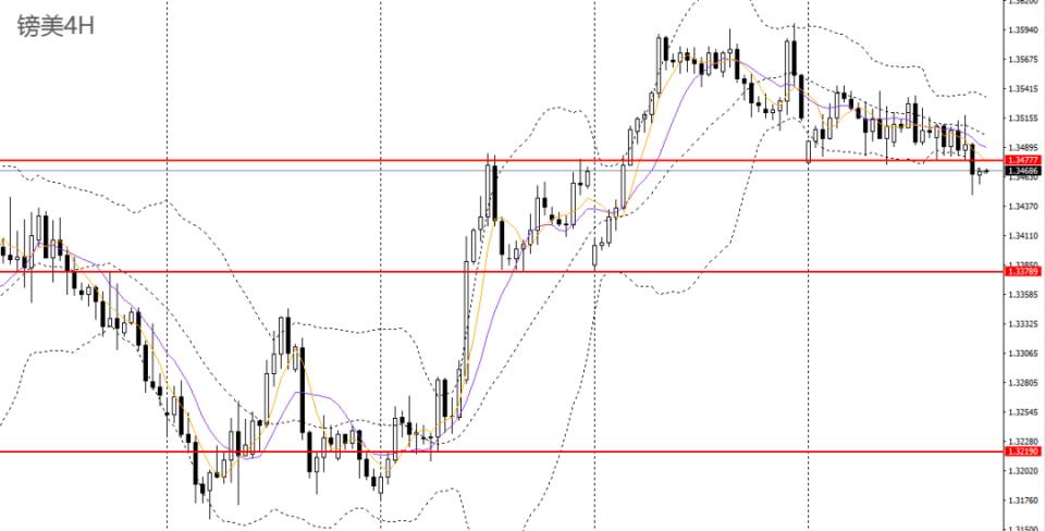 镑美周四沿5日均线阴跌,4小时失守1.3470一线支撑,短线打破此前高位震荡格局,1.3470附近承压可进空,后市可继续下看至1.3430一线。