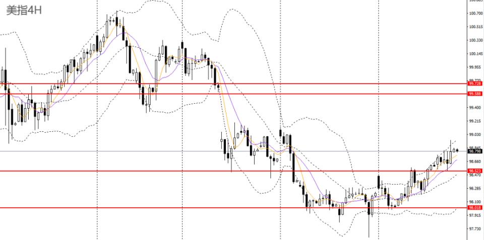 美元指数连日反弹,日线RSI升至50左右,4小时回踩98.50附近支撑企稳,上探99关口附近,短线走势仍强劲,后市有望继续挑战99.20一线。