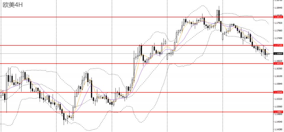 欧美周四继续阴跌,下探日线布林中轨,日线RSI位于50附近,4小时承压于1.17关口,如于1.17附近承压可进空,后市预计将进一步回踩1.1650一线。