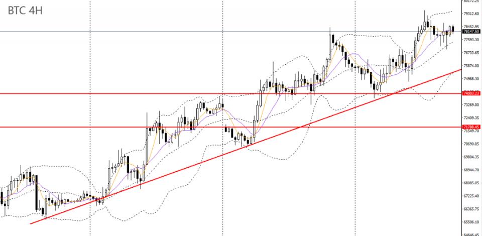 比特币昨日收十字阴线,仍受5日均线依托,4小时于76000附近支撑企稳,如维稳于上方,短线仍以看多为主,后市有望再度挑战80000大关。
