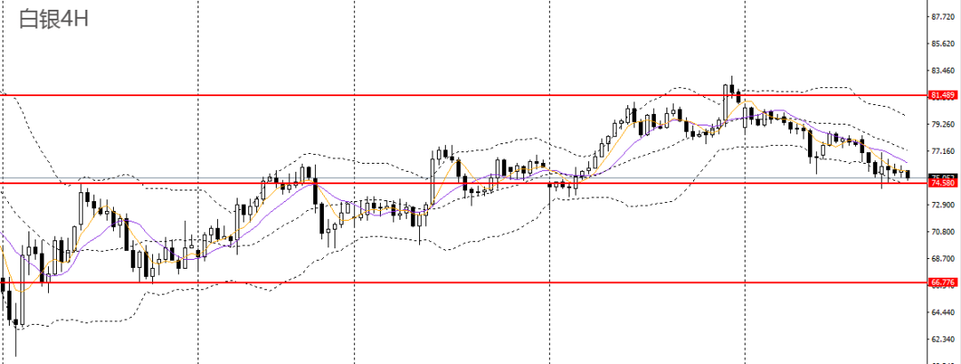 白银日线呈空方炮,承压于5日均线,日线RSI下破50,4小时价格重心逐步降低,回踩74.50附近支撑,空单可继续持有,如下破74.50,可继续看空至74。