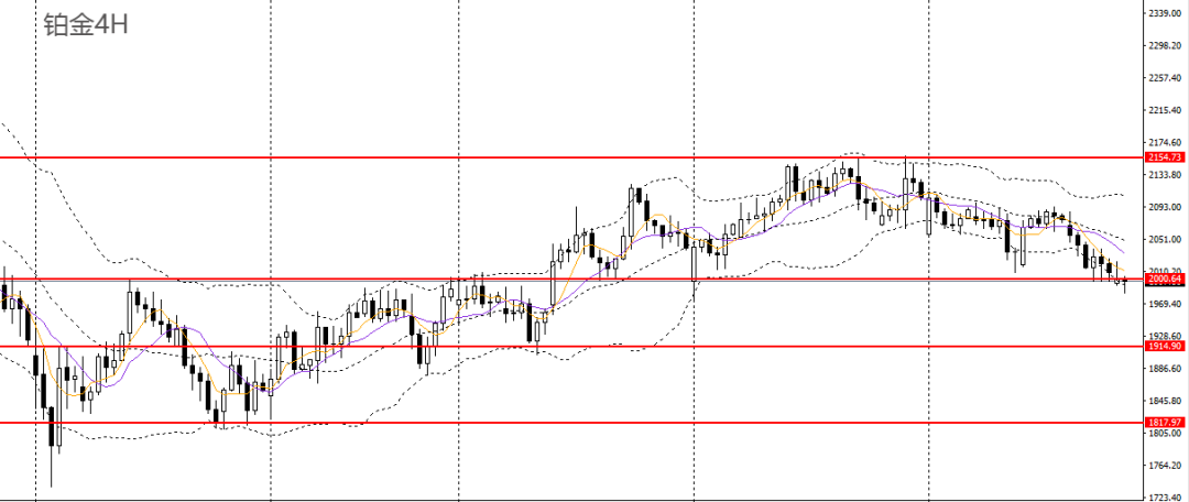 铂金昨日收跌,4小时刺破1980-2000支撑带,短线趋势转弱,如反抽至2020附近承压可进空,如失守1980,可下看至1950附近。