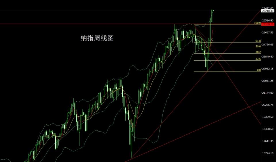 纳指市场上周低开在26418的位置后行情小幅回踩给出26370.12的位置后行情强势拉升,周线最高触及到了27321.57的位置后整理,周线最终收线在了27294.55的位置后,周线以一根基本饱和大阳线收线,而这样的形态收尾后,本周27000多止损26900,目标看27200和27300和27400和27500.
