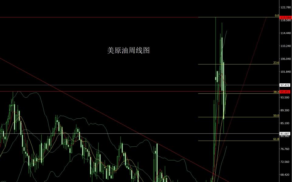 美原油市场上周高开在91.077的位置后行情先回落给出88.054的周线低点后行情强势拉升,周线最高触及到了100.71的位置后整理,周线最终收线在了97.06的位置后,周线以一根上影线稍长于下影线的的大阳线收线,而这样的形态收尾后,本周先拉升给出99.7空止损100.2,目标看98和97和96.