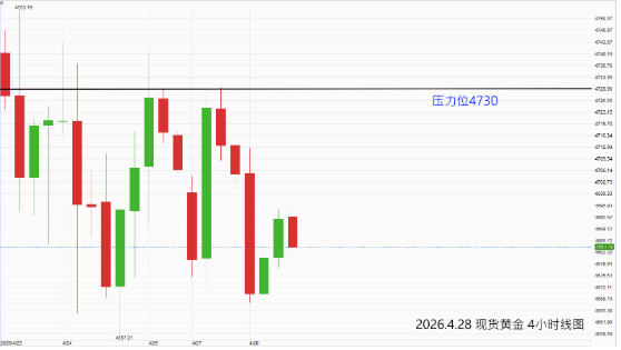 美股沿着日均线30MA下跌,日线KD信号偏空,4小时线图(如下图)来看,走势跌破4700美元关口,均线呈现空头排列、KD信号偏空,短线可以尝试逢高布局空单。
