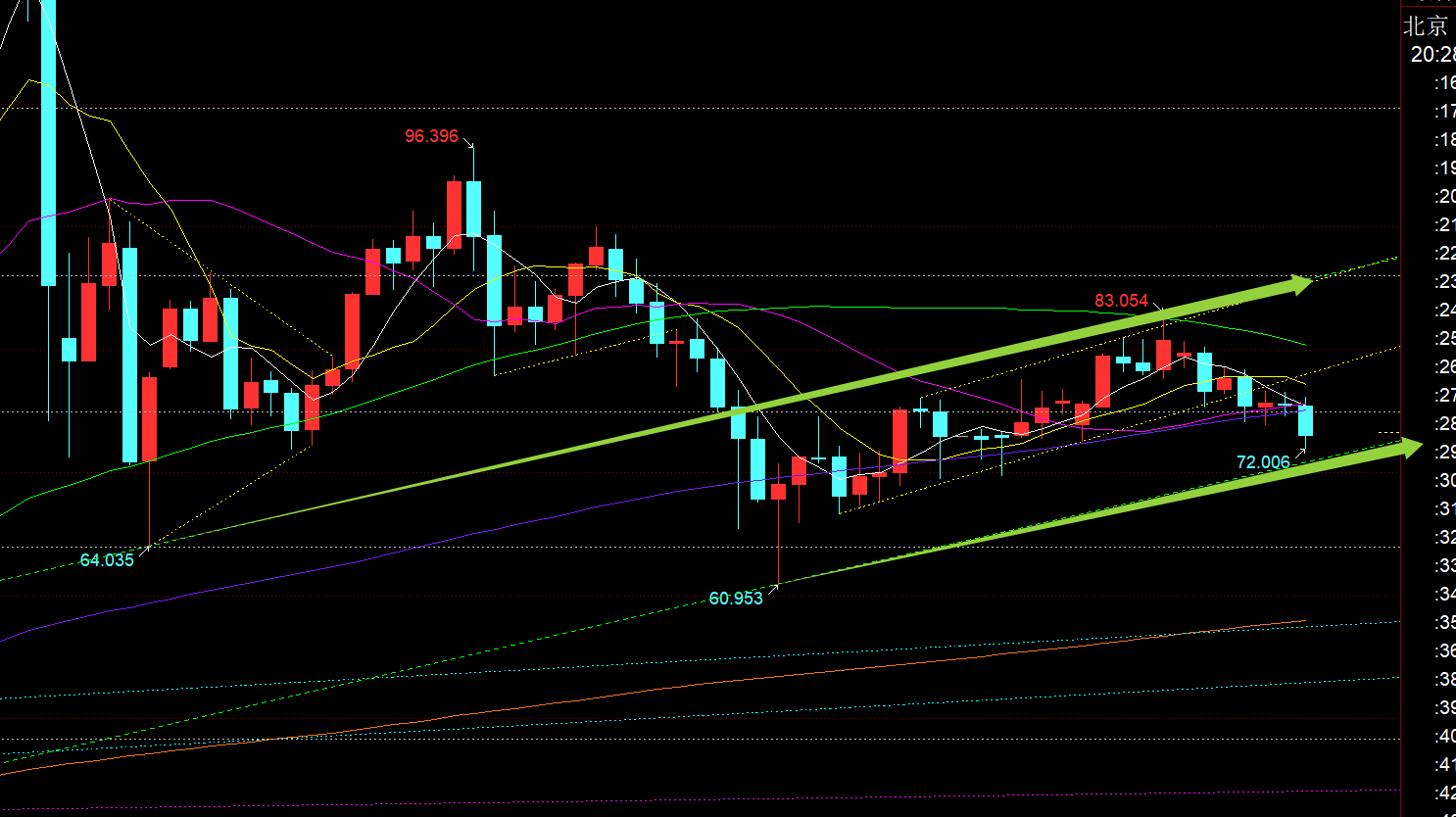 白银方面:周视频指出,若有效失守中轨,下方留意绿色通道下轨,对应大概71附近,而 72是83-61回踩的50%分割位置,也存在一些支撑;所以今晚支撑关注72-71,阻力就是顶底74-75,若后市重新突破站上75,那么诛心一箭的下破行情则有望走完,对应黄金就是4668;