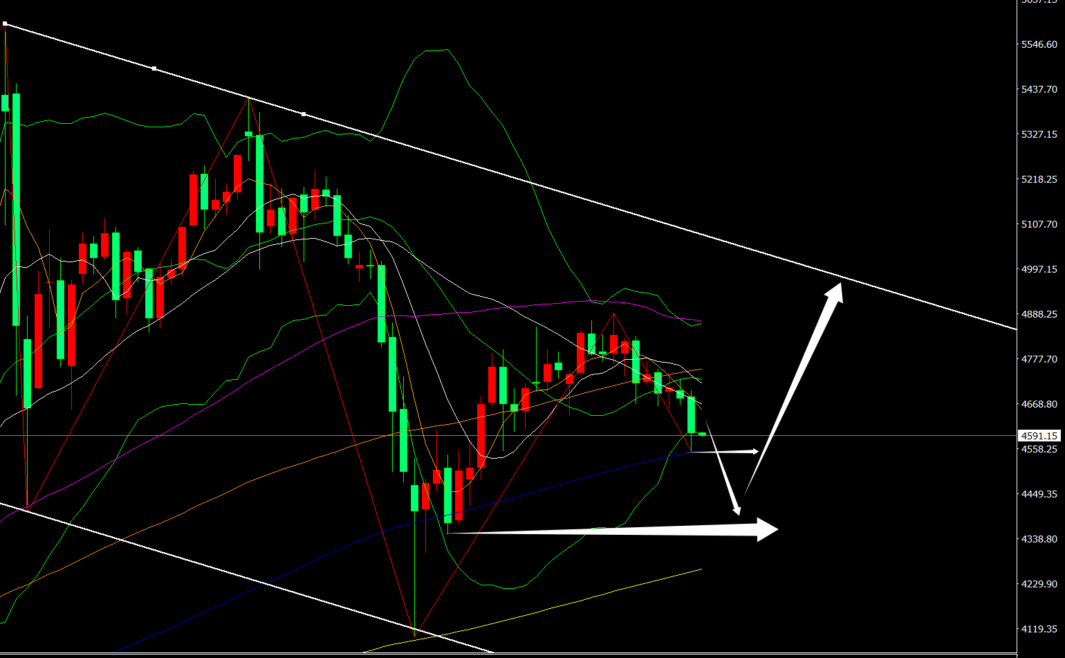 周图级别,金价上周回落收跌,仍处于10周均线下方,本周也如期回撤触及上周就给出的下行目标4550美元附近,后市如不能止跌反弹突破10周均线阻力,则仍有望再度调整至4400关口的预期。