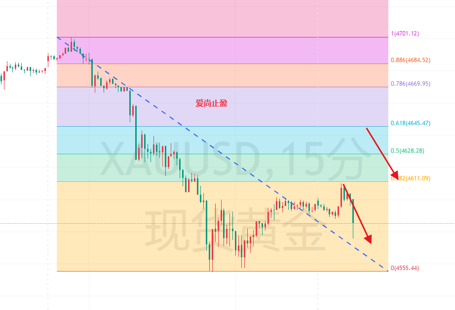 当前黄金,上方阻力关注4611,此位是昨天下跌反弹的382压力位,如果是看极弱,4611附近就是较为合适的空头入场位,强阻力关注4645,是昨天下跌反弹的618压力位,也是前期低开的低点,这是日内需要重点关注的做空位,下方支撑继续关注昨晚低点4555,若能有效跌破此位,黄金将延续走回落,反抽可以继续找机会做空,下方强支撑关注4402。