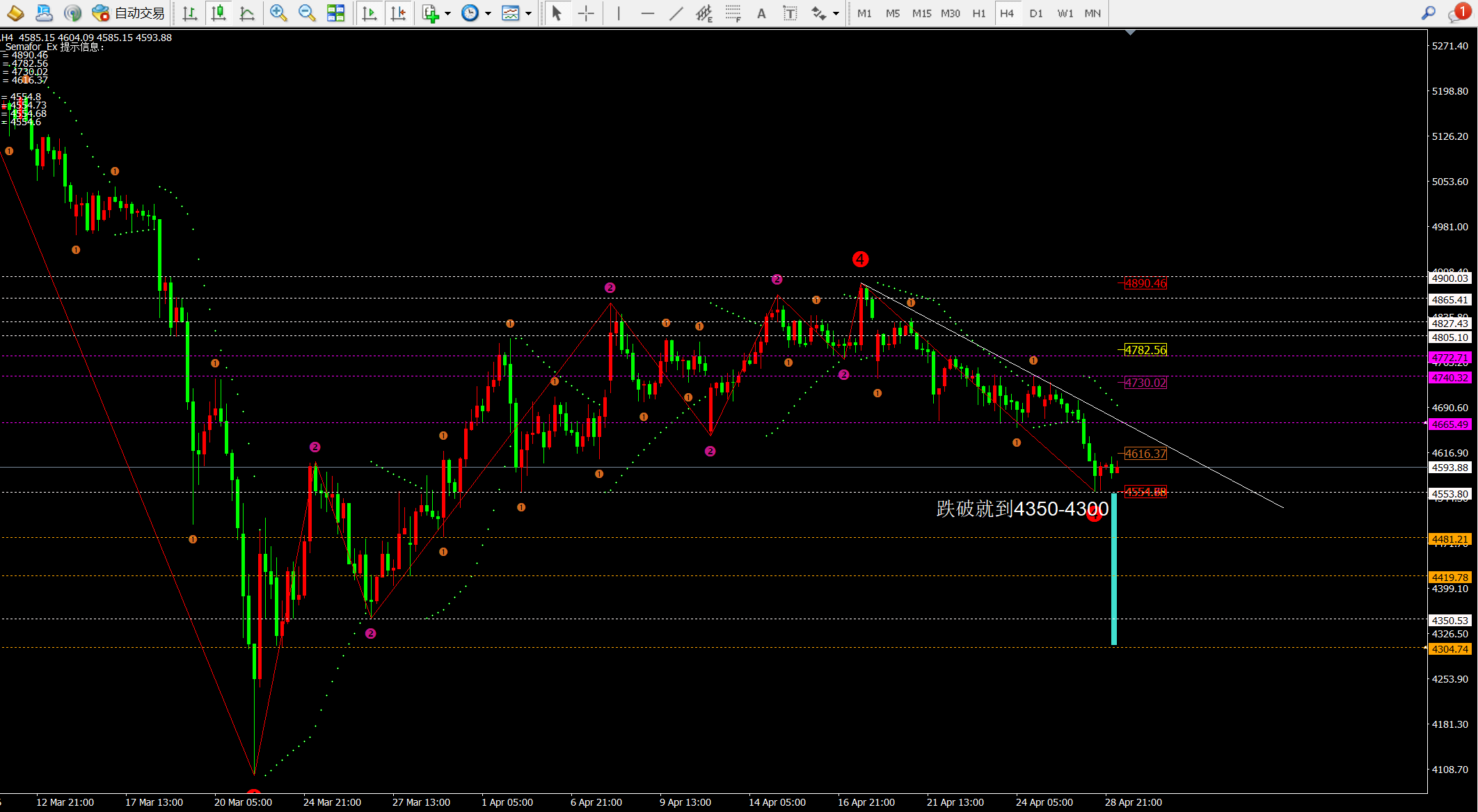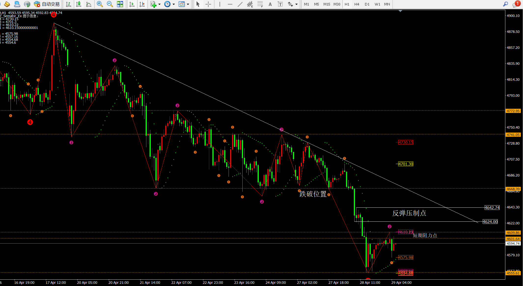 综合而言:目前趋势属于震荡偏弱,短期我们关注近期下破点4667和昨日低点的区间4667-4554一线;而目前4小时和小时有反弹迹象,所以可以在昨日低点上方去布局一次多单。同时目前上方关注4622-4630一线压制。